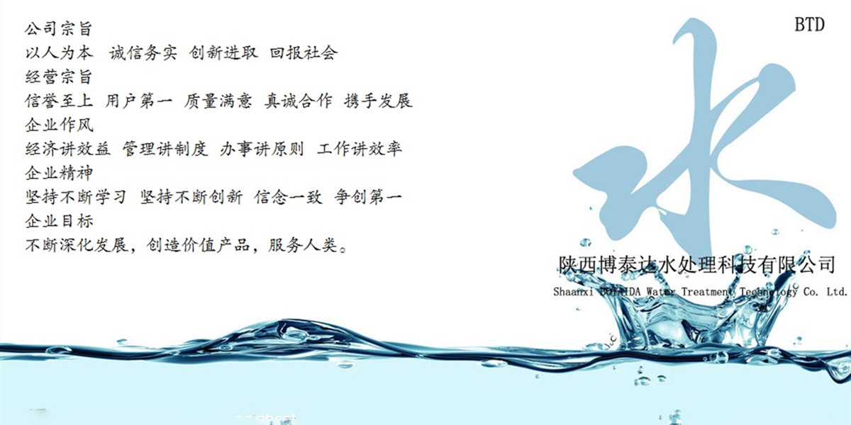 陜西博泰達水處理科技有限公司是西北一家集銷售、科研開發、安裝和技術服務為一體的高新環保科技型企業。公司以科技創新為先導,全心致力于人類環境保護和發展。以客戶滿意、打造完善服務為遵旨,為廣大用戶提供優質的水處理設備和空氣凈化系統。